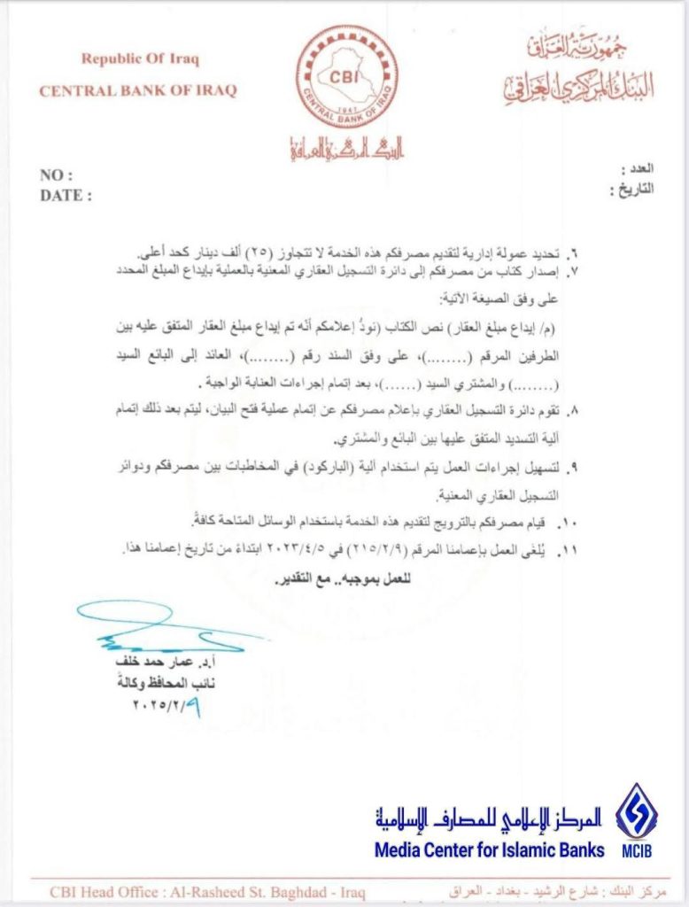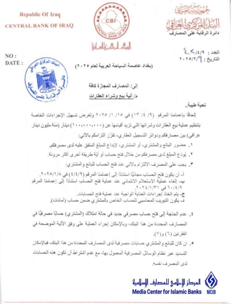 أصدر البنك المركزي العراقي اليوم الأحد ٢٠٢٥/٢/٩ كتاب وجه فيه المصارف المجازة كافة بتسهيل الإجراءات الخاصة بتنظيم عملية بيع وشراء العقارات التي تزيد قيمتها عن (١٠٠ مليون ) دينار عراقي